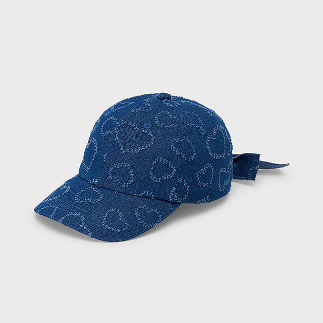 Süße Mayoral Mütze in Denim-Optik mit feinem Herzmuster – ideal für sonnige Tage und kleine Trendsetterinnen.